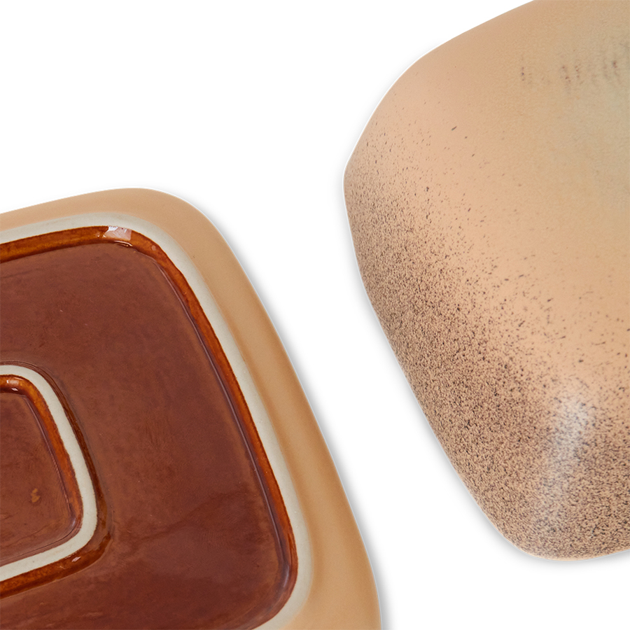 Mit der Butter Dish Breeze von HKliving bleibt deine Butter kühl und deine Tischdeko bekommt einen retro-touch. Die 70’s Butterdosen aus Steingut sind einzigartig, da sie von Hand glasiert werden, jede fällt ein wenig anders aus und ist ein Unikat. Mit der extravaganten Butterdose der 70er Jahre liegst du voll im Trend. Die Butter Dish Breeze von HKliving besteht aus Steingut und ist handgefertigt. Die Butterdose überzeugt durch das Zusammenspiel von hellen und dunklen Farbtönen und lässt sich wunderbar kombinieren.