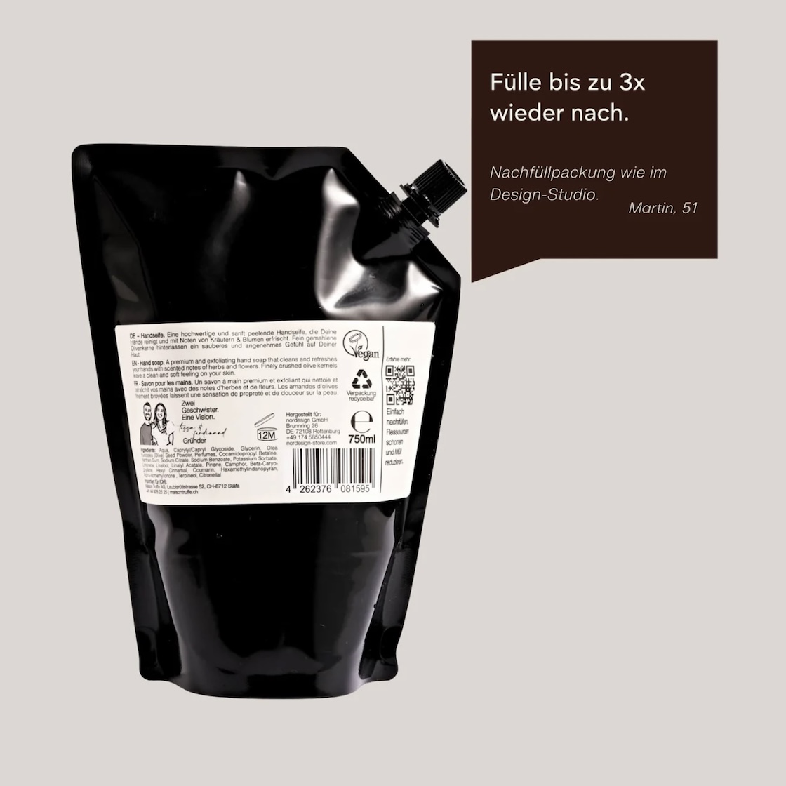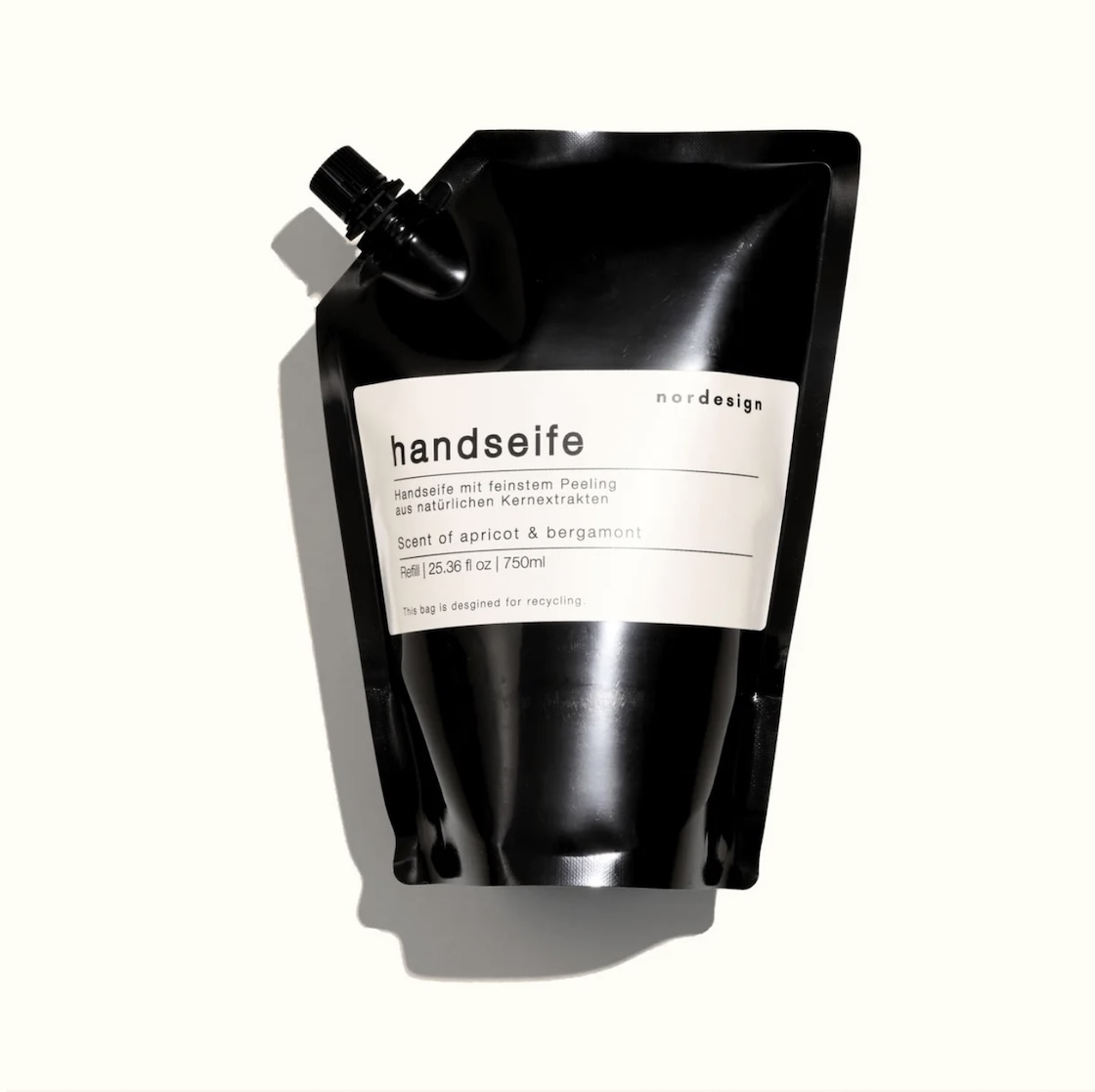 Mit der Handseife Peeling Nachfüllpackung von nordesign kannst du deine Flasche bis zu drei Mal wieder auffüllen. Täglich waschen wir uns mehrmals die Hände. Dabei spielt die Wahl unserer Handseife eine entscheidende Rolle – nicht nur für unsere Umwelt, sondern auch für unseren Körper. Mit der Nachfüllpackung unserer aromatischen Handseife mit feinstem Peeling bekommst Du 750ml nachhaltige Pflege mit einem dezenten, hochwertigem Duft aus Aprikose und Bergamotte. Die natürlichen, fein gemahlenen Olivenkerne sorgen für einen sanften Peeling-Effekt, der abgestorbene Hautzellen entfernt und die Hautstruktur verbessert – für spürbar geschmeidige Hände. Gleichzeitig versorgt die Seife Deine Haut mit wertvoller Feuchtigkeit und hinterlässt einen schützenden Film gegen äußere Einflüsse. Mit der Handseife Peeling Nachfüllpackung von nordesign kannst Du Deine Handseife 3x wieder auffüllen und sparst dabei Verpackungsmaterial, ohne auf ein luxuriöses Handpflege-Erlebnis zu verzichten. Eine natürliche Hand Wash Experience – nachhaltig, pflegend und wohltuend duftend für eine Auszeit im Alltag. Die Nachfüllpackung ist recycelbar und kommt ohne den Einsatz von Carbon Black aus, wodurch sie einfach in den Recycling-Kreislauf zurück gegeben werden kann.