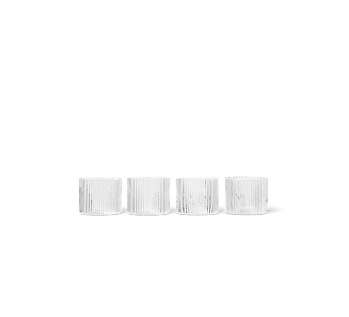 Die Ripple low glasses von ferm LIVING sind Teil der Ripple Glas Kollektion, die mit ihrer geriffelten Oberfläche eine moderne und dynamische Optik bietet. Die praktischen und schönen Gläser in der Farbe clear werden aus mundgeblasenem Glas hergestellt. Die geriffelte Oberfläche der Ripple low glasses von ferm LIVING ist nicht nur optisch sehr ansprechend, sie ermöglicht zusätzlich einen sicheren und rutschfesten Griff. Das Set besteht aus vier Gläsern und jedes einzelne davon weist die unverwechselbare Verwendung von geometrischen Ebenen auf, die für diese Serie so charakteristisch sind. Vervollständige deinen Trinkgenuss mit der passenden Karaffe von ferm Living oder kombiniere sie mit anderen Stücken aus der Ripple-Glaskollektion.