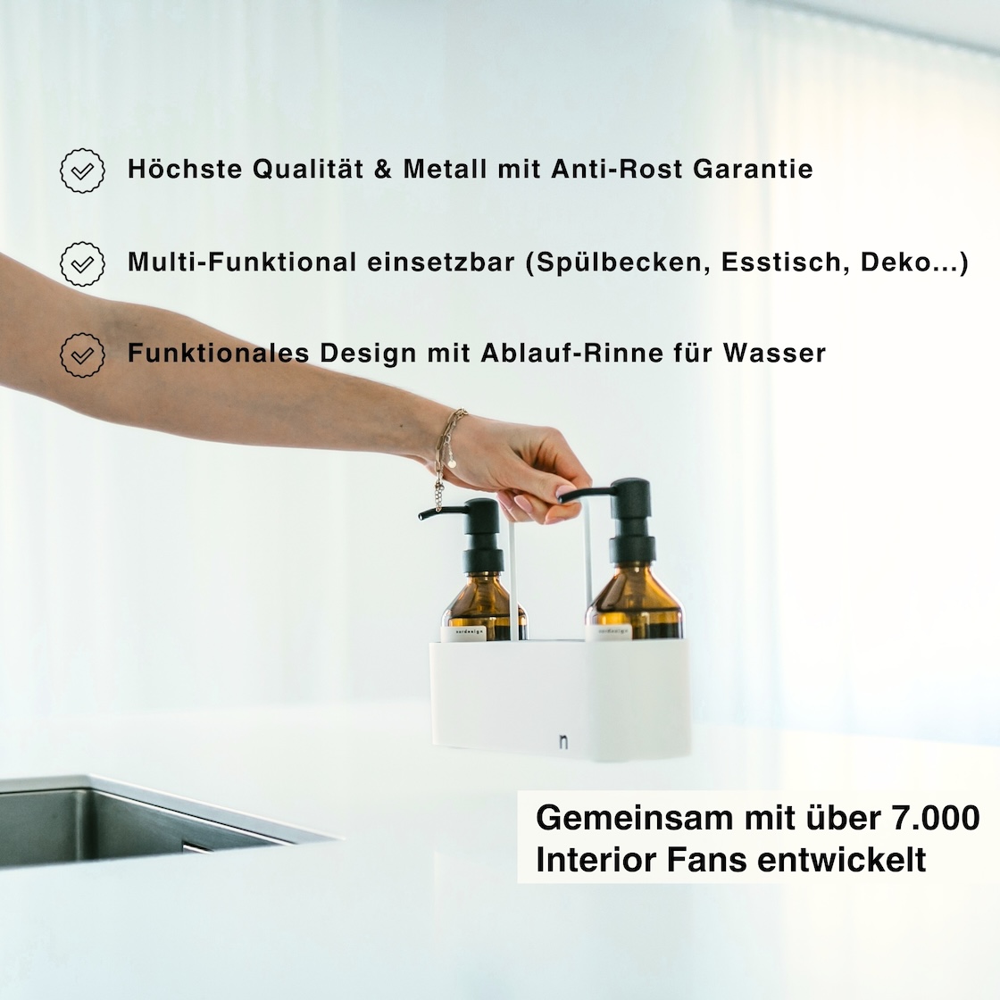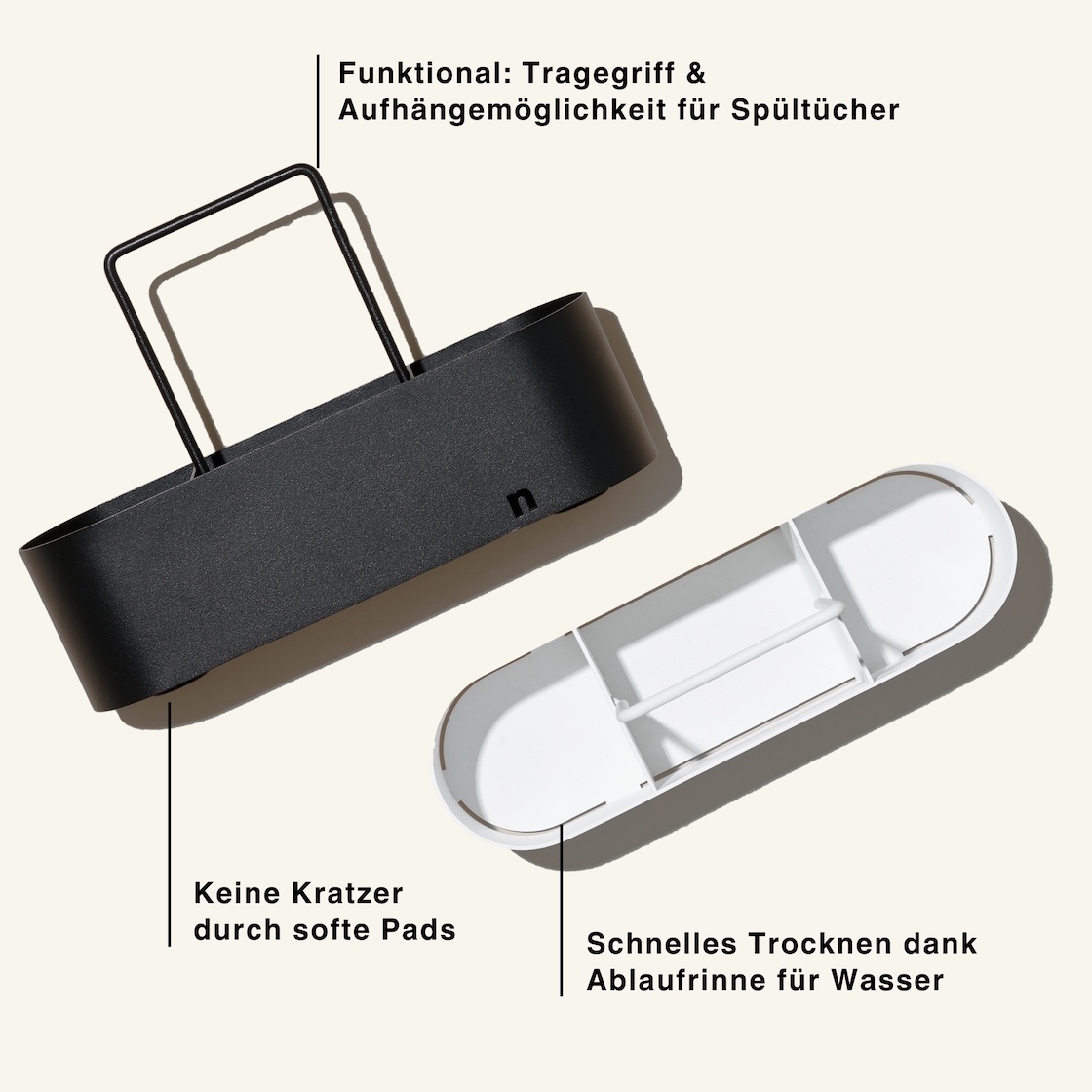Nutzt Du das Design-Piece als Spülbecken Organizer, so sorgt die Ablaufrinne dafür, dass das Wasser Deiner nassen Schwämme jederzeit abtropfen kann. Der praktische Tragegriff kann als Halterung für Spültücher umfunktioniert werden. Die auf der Unterseite des Organizers angebrachten Polster verhindern Kratzer auf empfindlichen Oberflächen. Unsere zeitlose Interior-Farbe Weiß, das eingravierte nordesign Logo sowie die Pulverbeschichtung verleihen dem Spülbecken Organizer Weiß von nordesign einen hochwertigen Look & Feel.